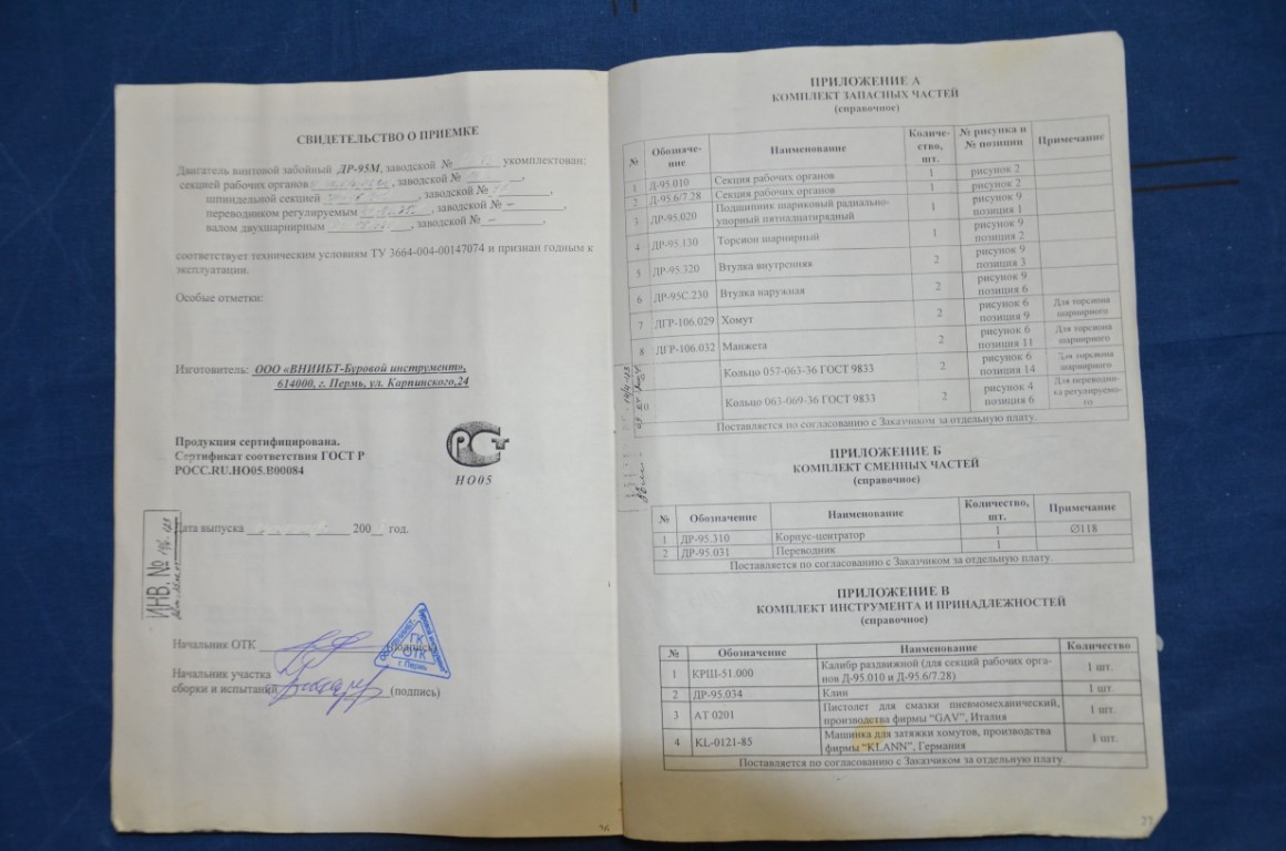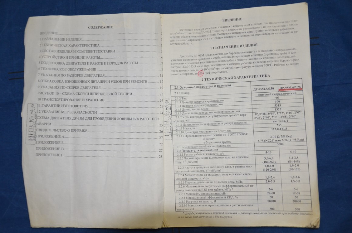 Двигатель ДР-95М предназначен для бурения скважин (в т.ч. наклонно-направленных, участков изменения кривизны и стабилизации (с вращением колонны бурильных труб) и для проведения ремонтно-восстановительных работ в эксплуатационных колоннах долотами диаметром 112,0 123,8 мм с использованием в качестве рабочей жидкости воды или бурового раствора плотностью до 1,3х10 3 кг/м.куб. при забойной температуре не более 100 С. Рабочая жидкость может содержать до 10% нефтепродуктов.