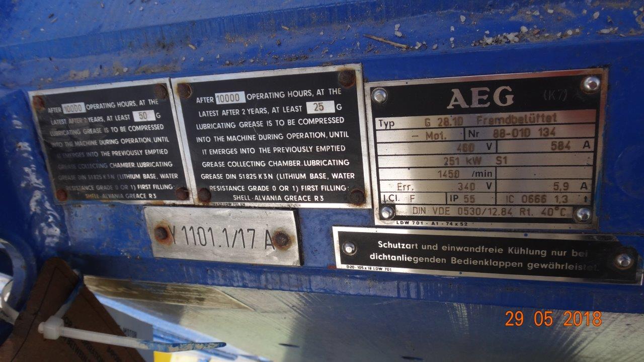 Мощность 250 кВт при 1 500 об/мин. Двигатель с шунтом постоянного тока, отдельно охлаждаемый воздушным охладителем и воздуходувкой (мощность 8 кВт), интегральные термисторы и тахогенератор. Защита IP 55 (соединительная коробка IP 65).